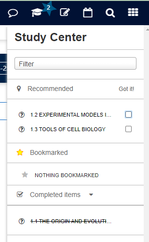 The study center is very student driven. We don’t gate, force path, or lock content to users. This is based on research around student motivation. Force pathing students (and taking the control out of their hands) often hurts proficiency, so we opt to provide information to the user to allow them to take control of the adaptive experience.