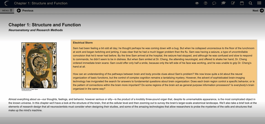 Courses are organized into sections that map to clear learning objectives. Each section includes the e-book, relevant media resources, formative activities, and practice self-assessment.